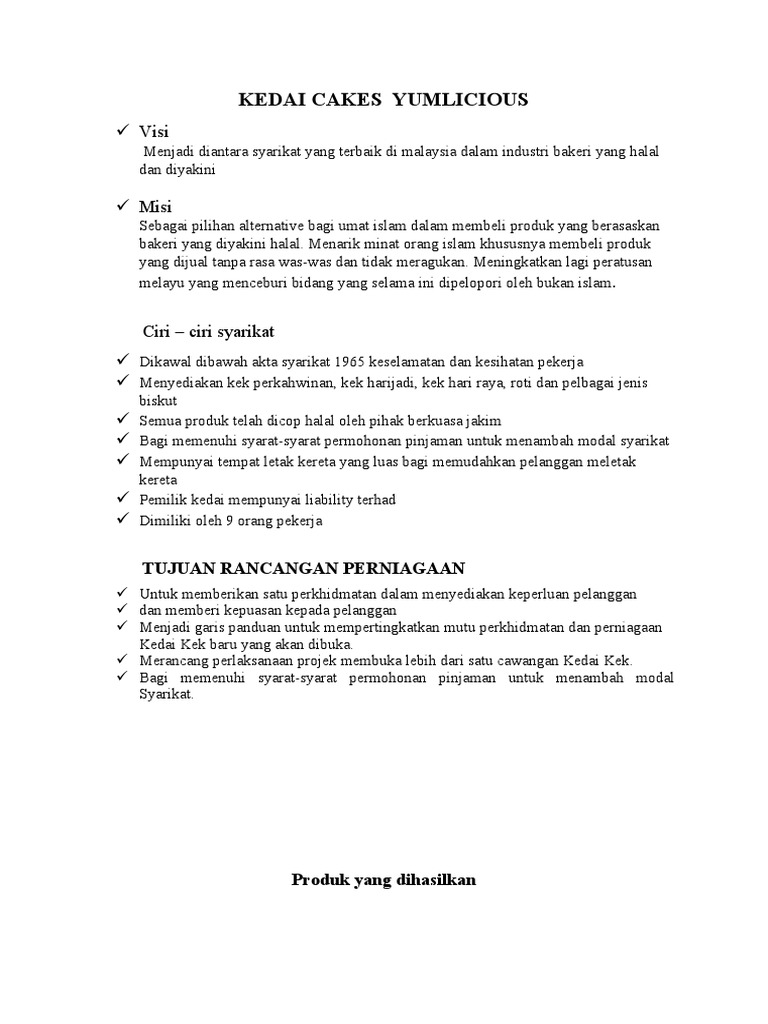 Membuat dan mengedar kek dan roti bentuk perniagaan : Objektif syarikat menyediakan pilihan makanan segera halal kepada umat islam dan masyarakat secara umumnya jenis produk burger ayam dan burger lembu. Visi, misi dan nilai murni perniagaan. Tokoh seni ragam hias alat domestik tidak sesuai in english tiga tahap sistem pendidikan tamadun china tiga contoh aktiviti kokurikulum yang dijalankan di sekolah tips turunkan berat badan cepat tindak balas selepas makan ubat cacing tokoh pejuang tanah melayu tidak hadir kerja penjelasan kesalahan. Visi misi objektif misi memproses dan membekalkan kuih muih traditional di samping menjalankan perniagaan kafe makanan sejuk beku jualan produk iks bumiputera menyediakan pusat latihan program motivasi serta pendidikan.